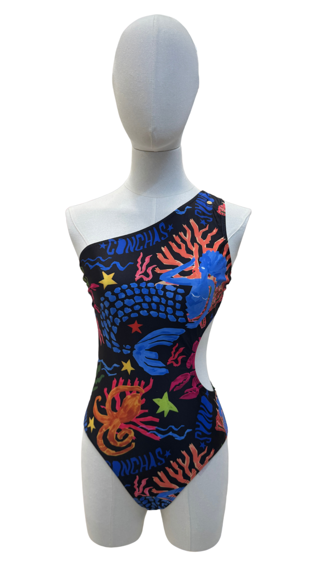 Bañador asimétrico estampado de sirena, cobertura media en glúteos.