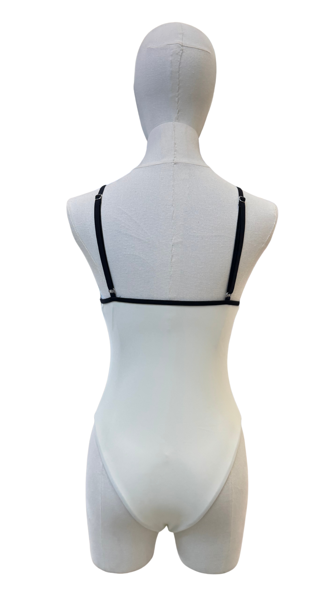 Bañador bicolor con moño, tirantes ajustables y. Obertura media en glúteos.
