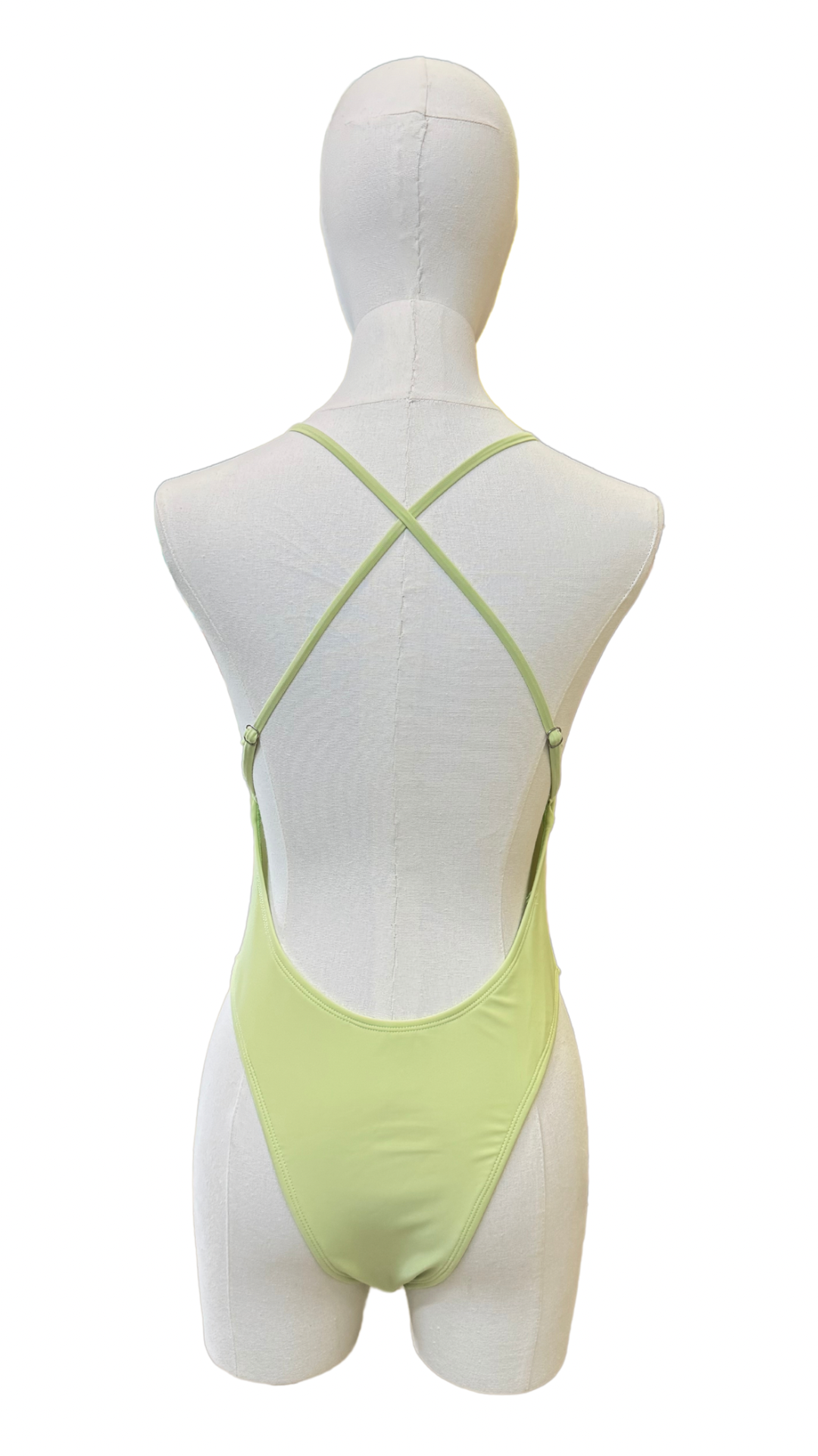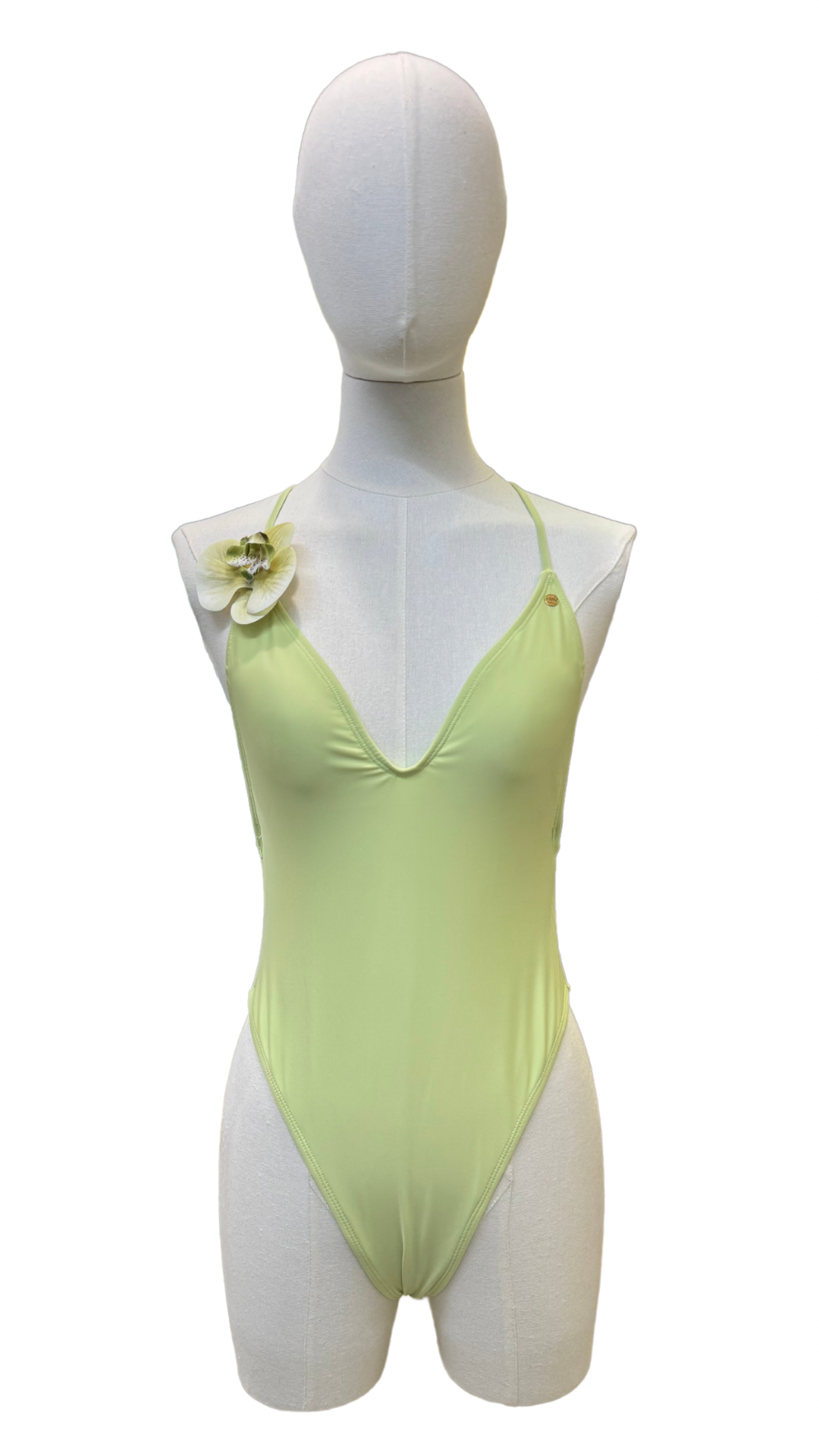 Bañador de espalda cruzada con orquídea. Tirantes completamente ajustables.