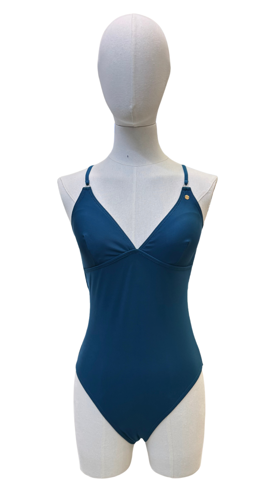 Bañador de espalda cruzada y descubierta, cobertura media en glúteos.
