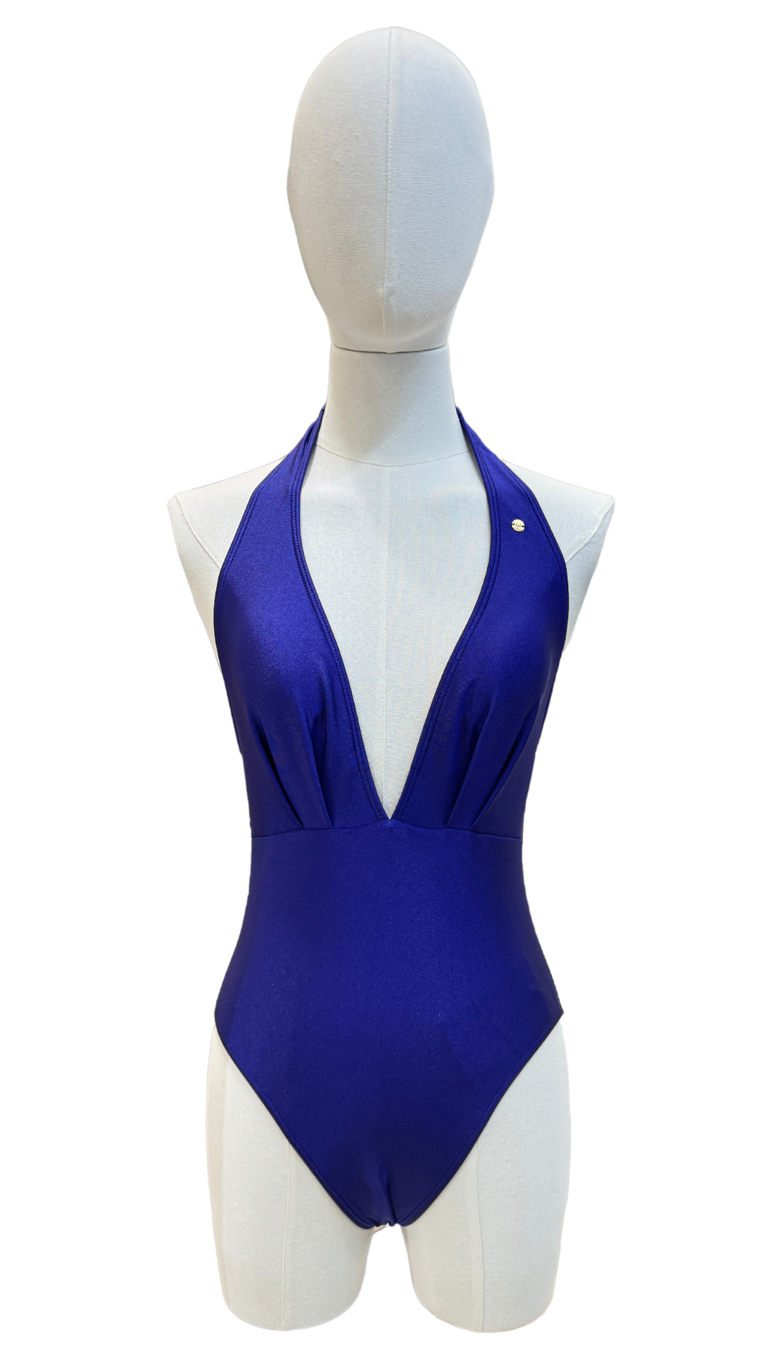 Bañador escote en V halter. Tirantes completamente ajustables, tela con destellos y bottom de cobertura amplia en glúteos.