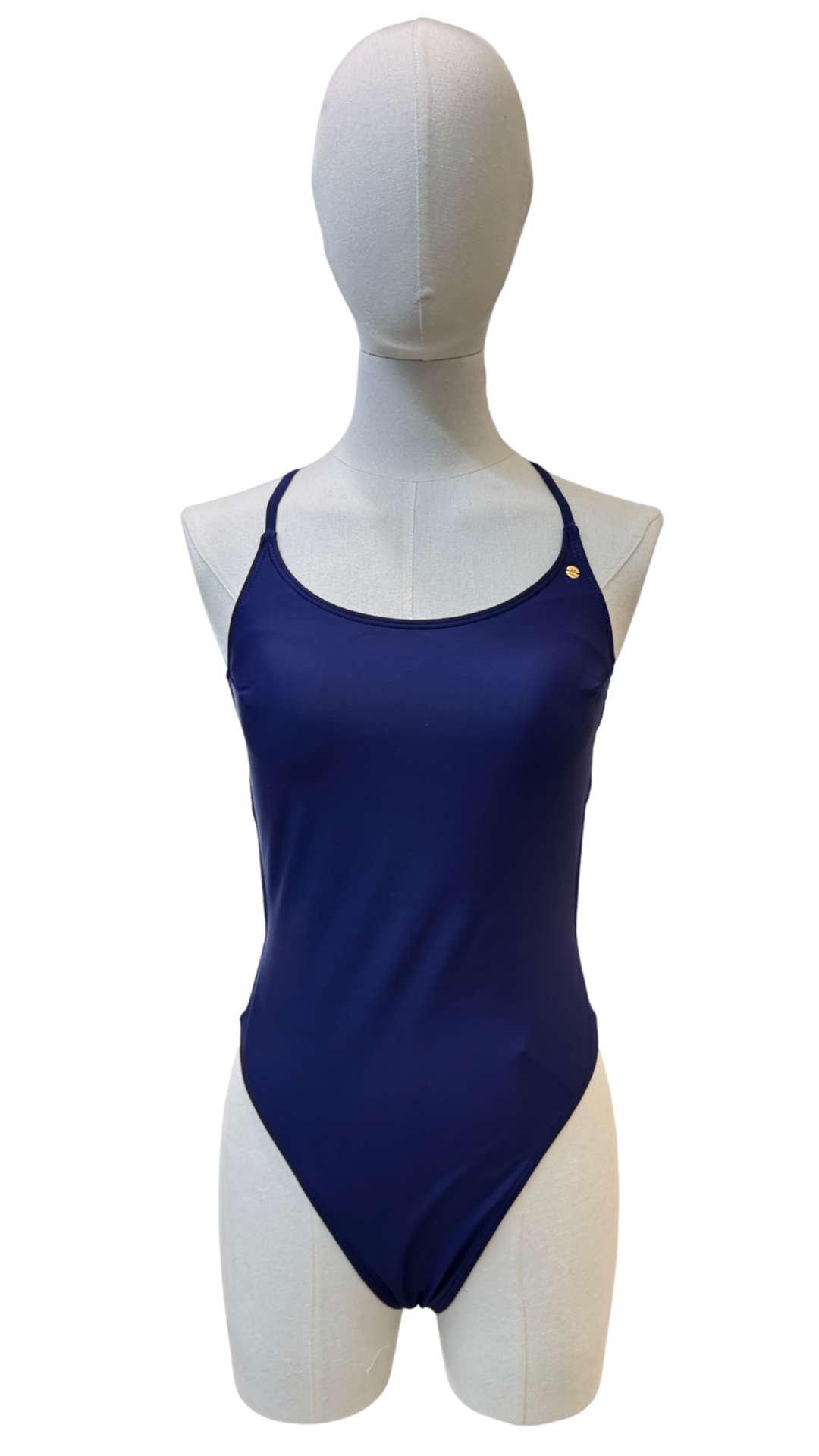 Bañador de espalda cruzada con tirantes ajustables, cobertura media en glúteos.