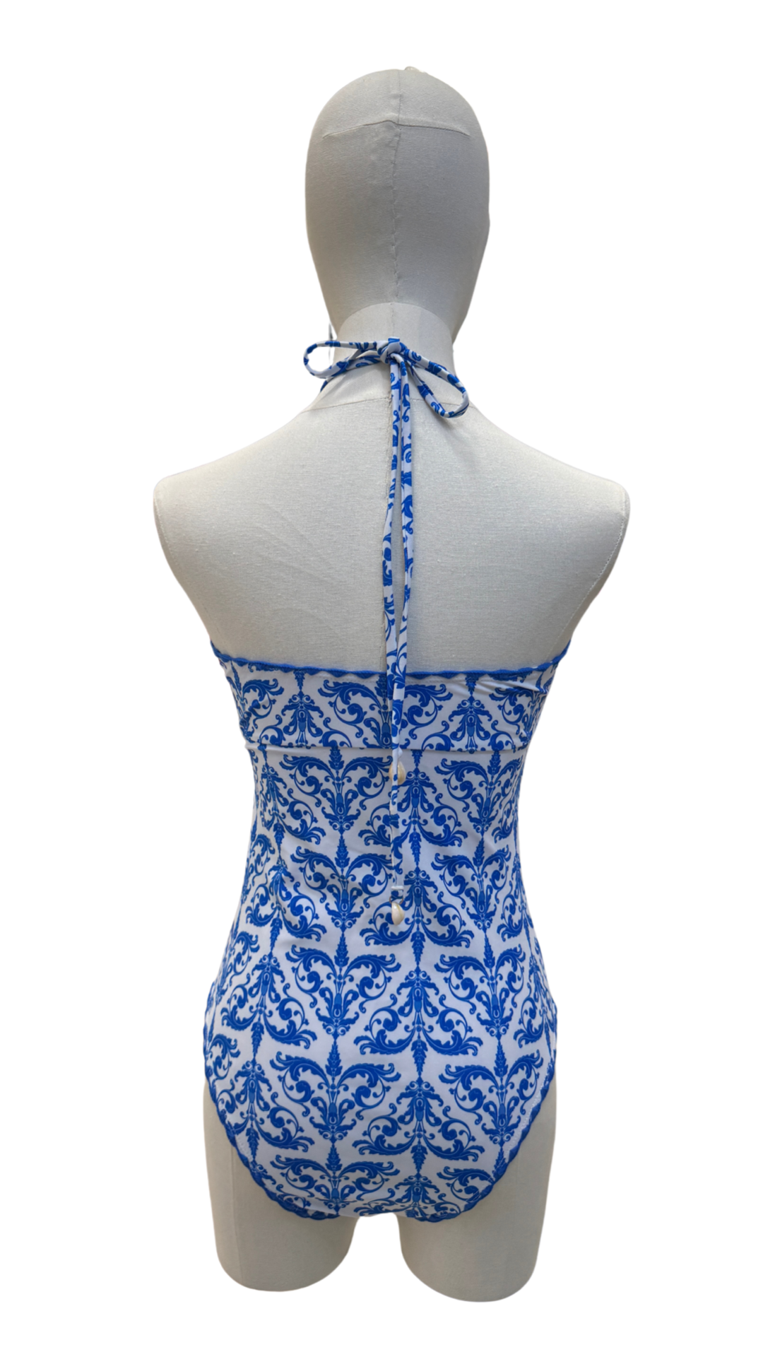 Bañador strapless estampado con detalles de conchitas. Cobertura amplia en glúteos.