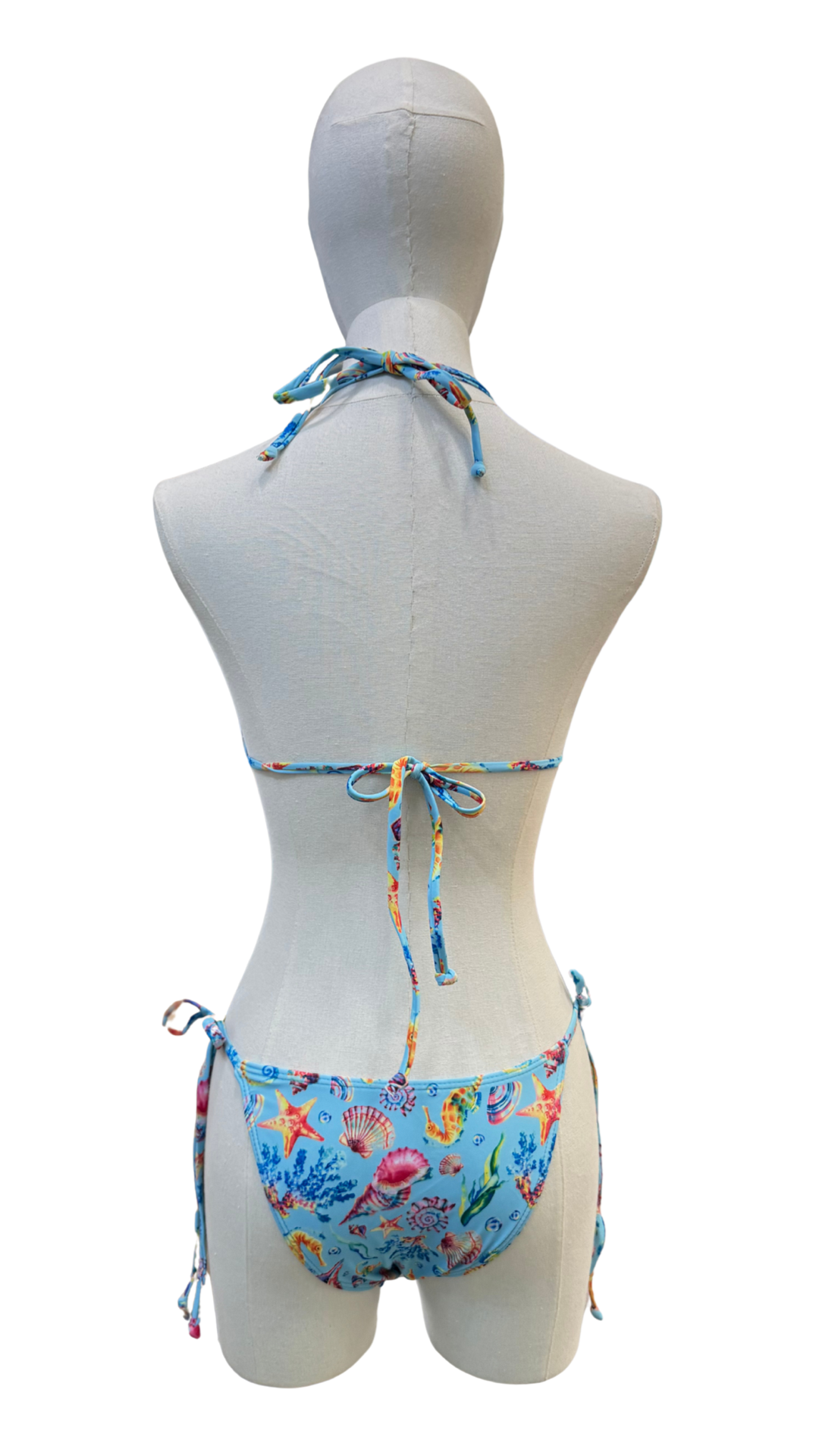 Set bikini completamente ajustable de estampado marino + pareo corto de tela mesh con olanes, cobertura amplia en glúteos.