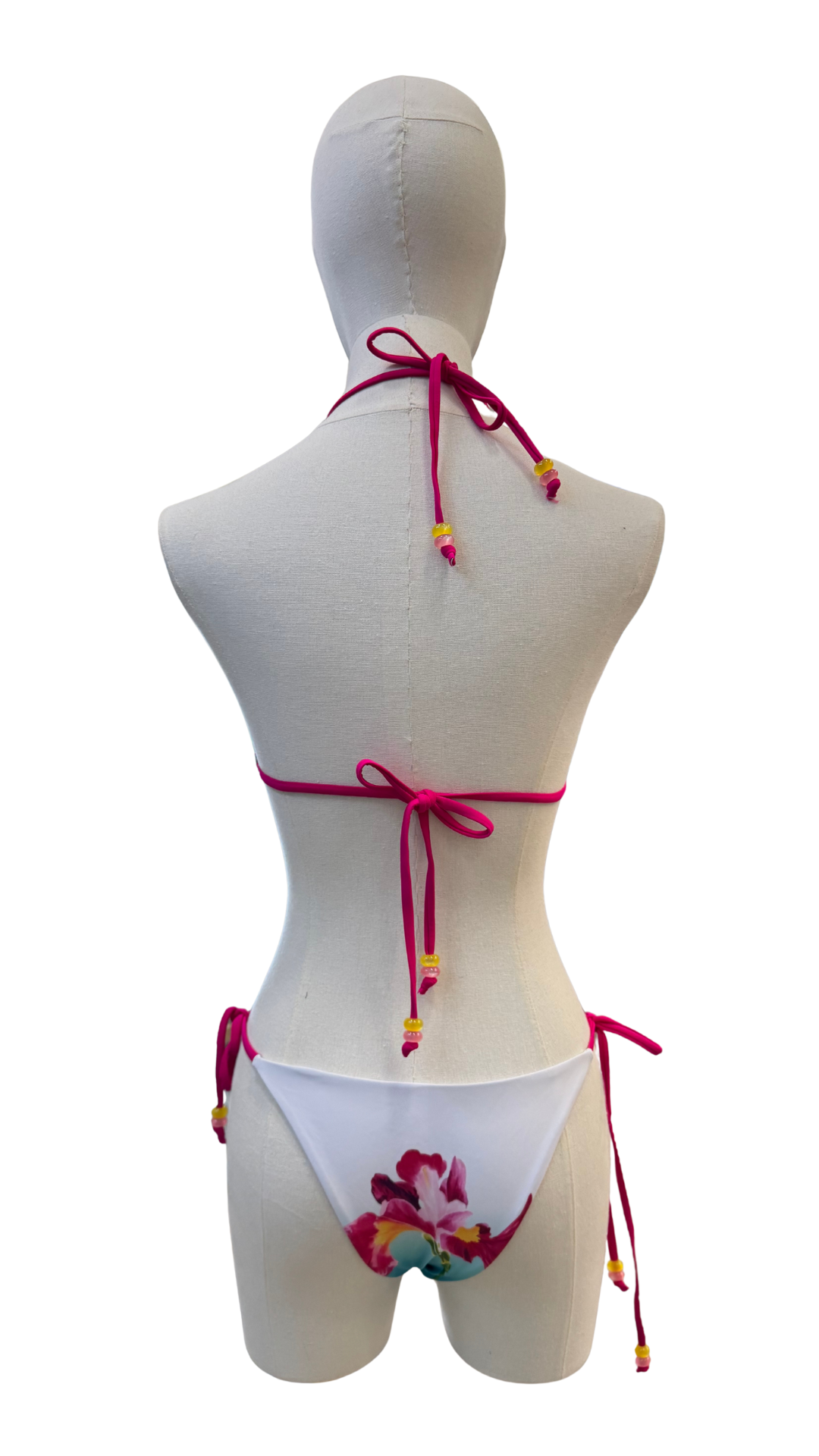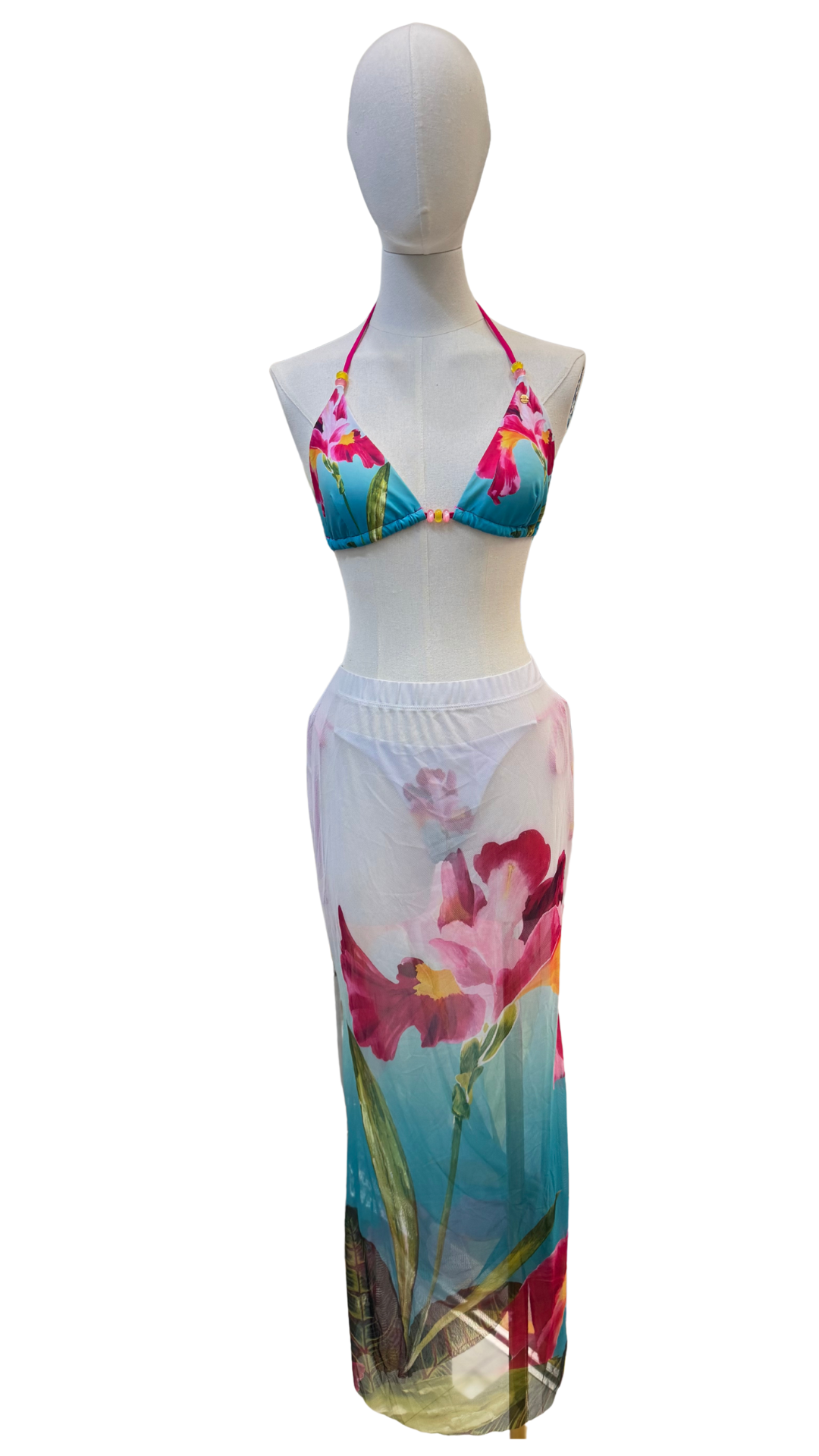 Set bikini completamente ajustable + pareo largo de tela mesh, cobertura media en glúteos.