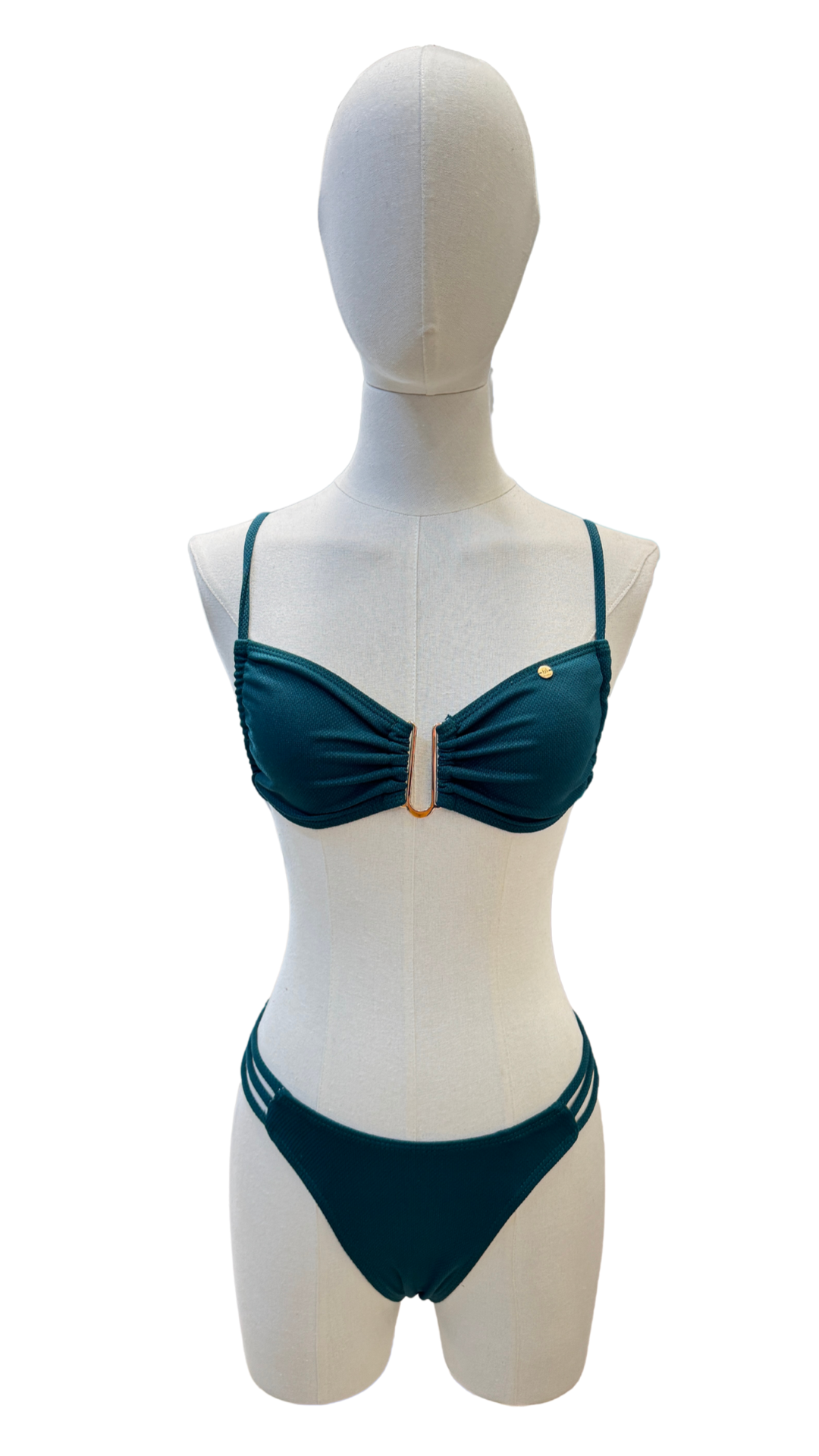 Set bikini con detalle en U, top completamente ajustable y bottom con cobertura media en glúteos.