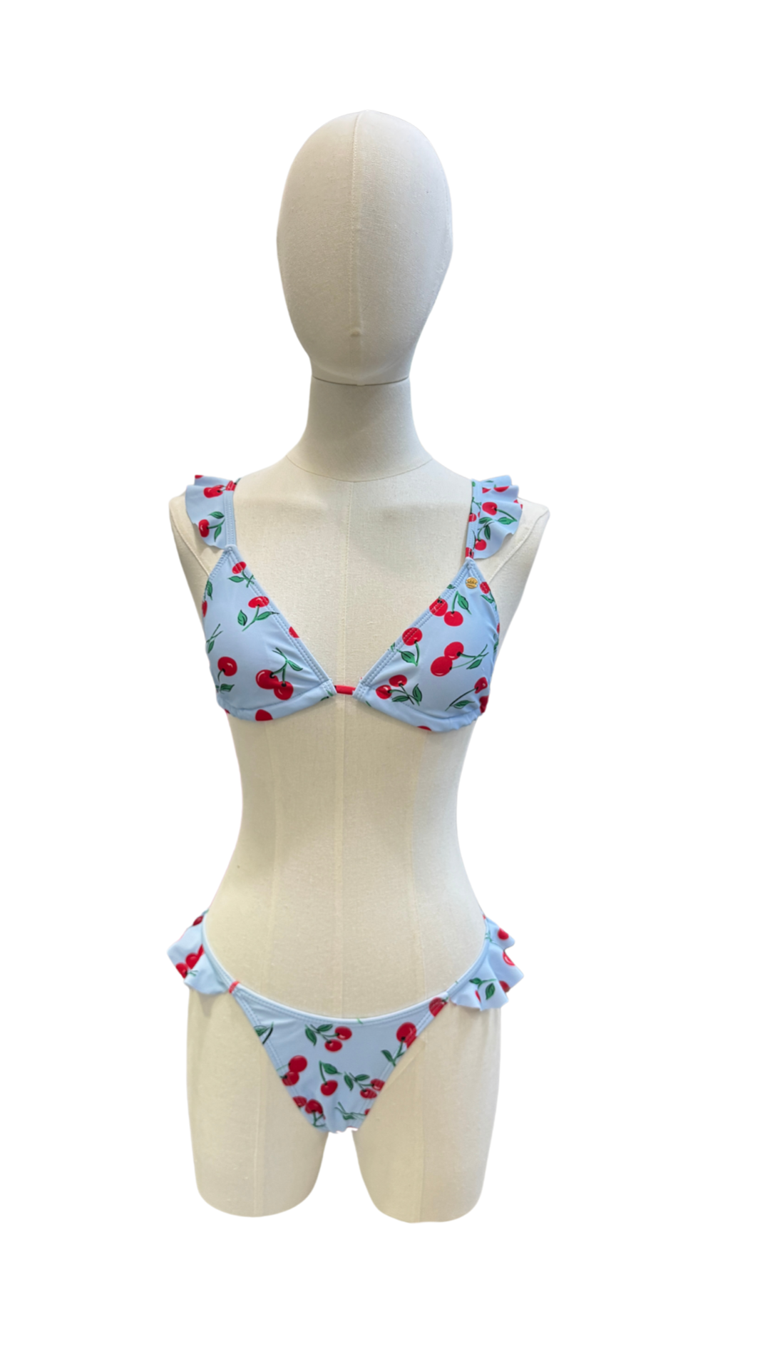 Set bikini con estampado azul de cerezas, top con tirantes ajustables, detalles de olanes.