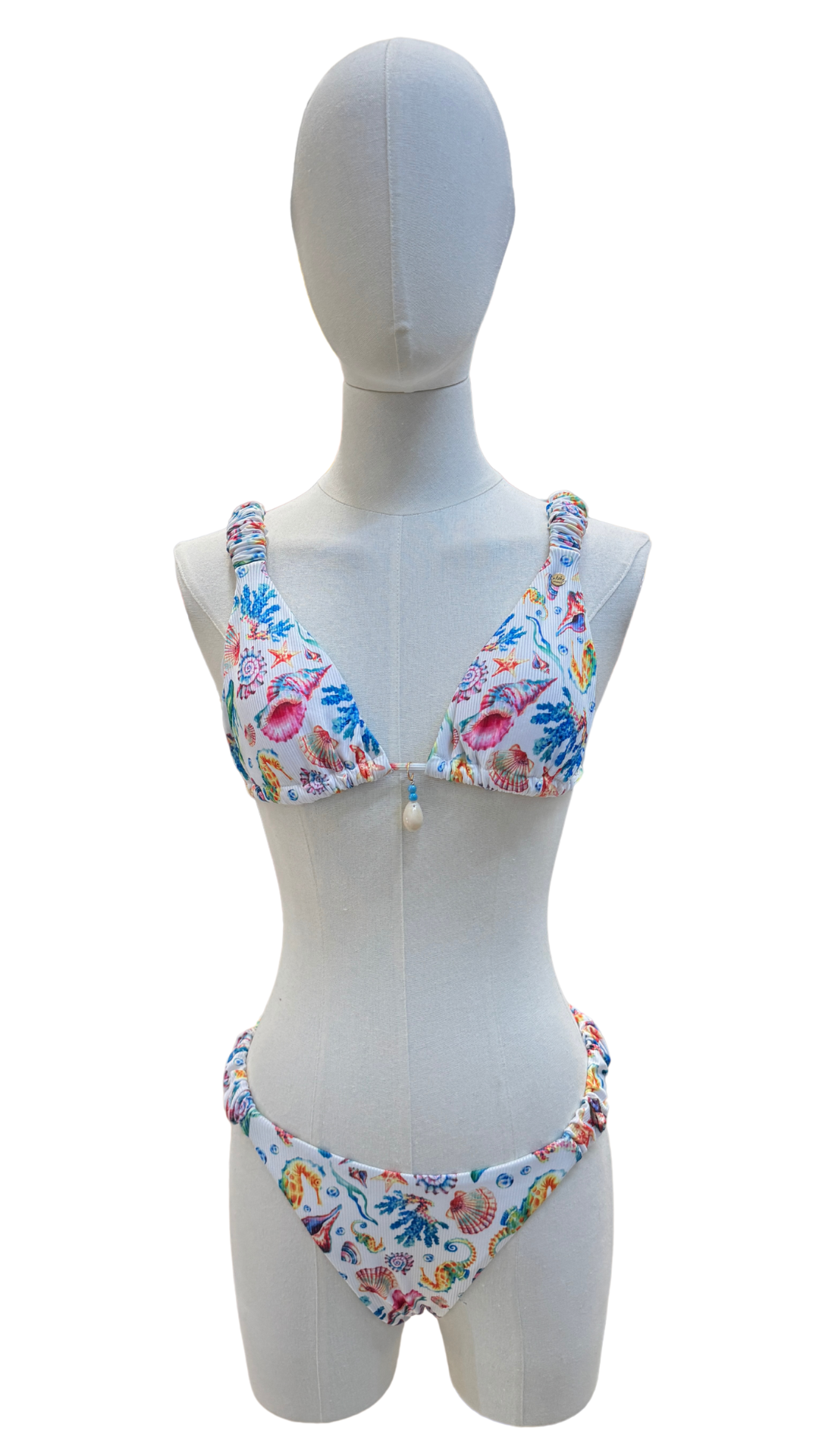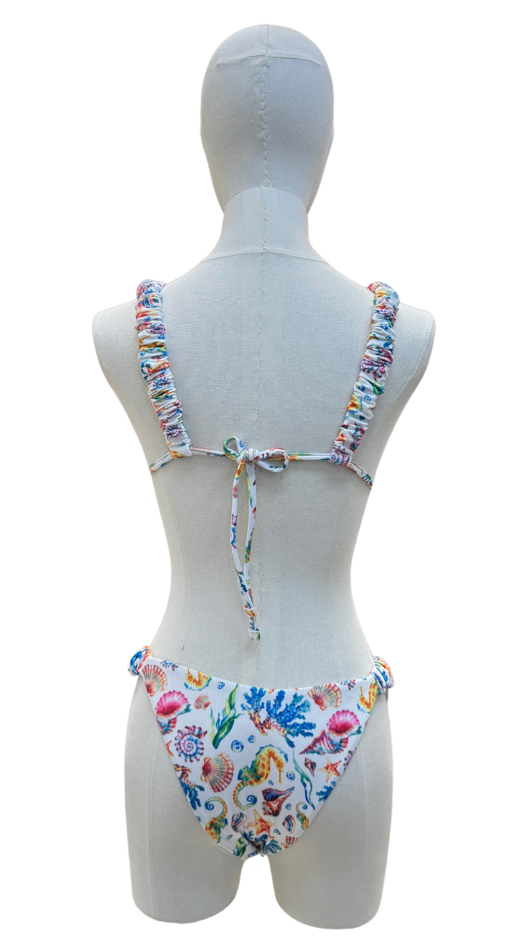 Set bikini de estampado marino, tirantes ajustables, detalle de elástico en ambas piezas, bottom con cobertura media en glúteos.