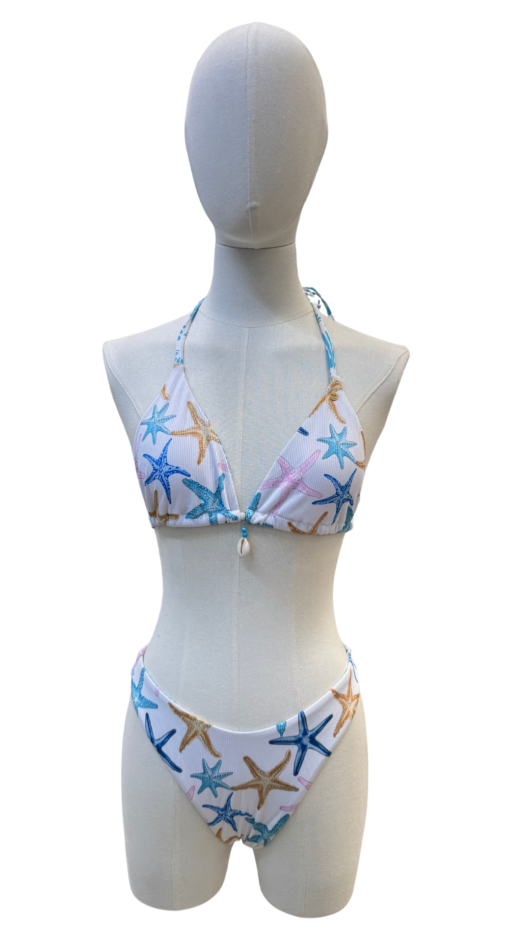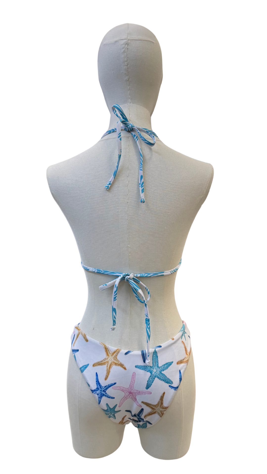 Set bikini de Estrella y concha reversible, top de triángulo completamente ajustable. Cobertura media en glúteos.