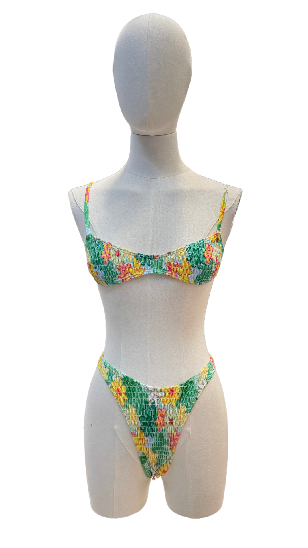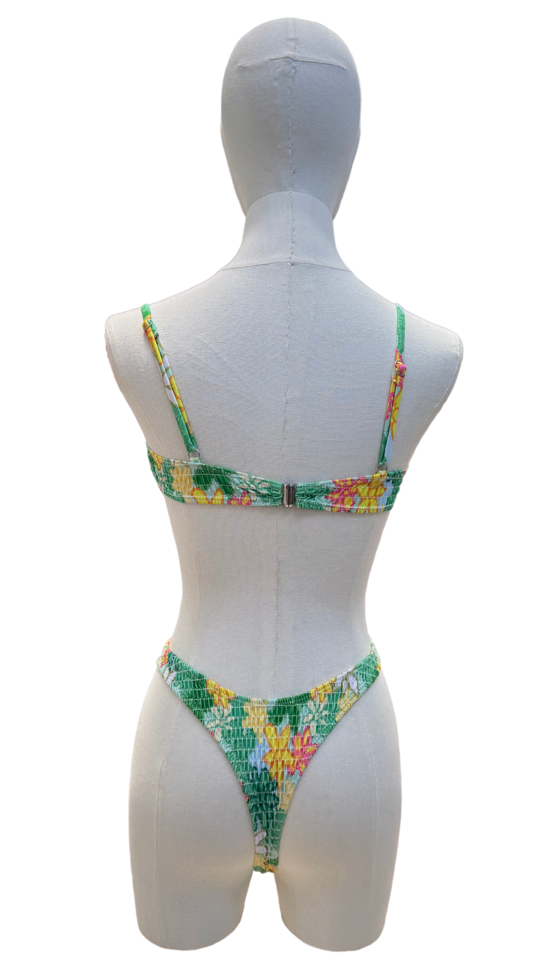 Set bikini de tanga con tela fruncida, estampado tropical, tirantes ajustables.