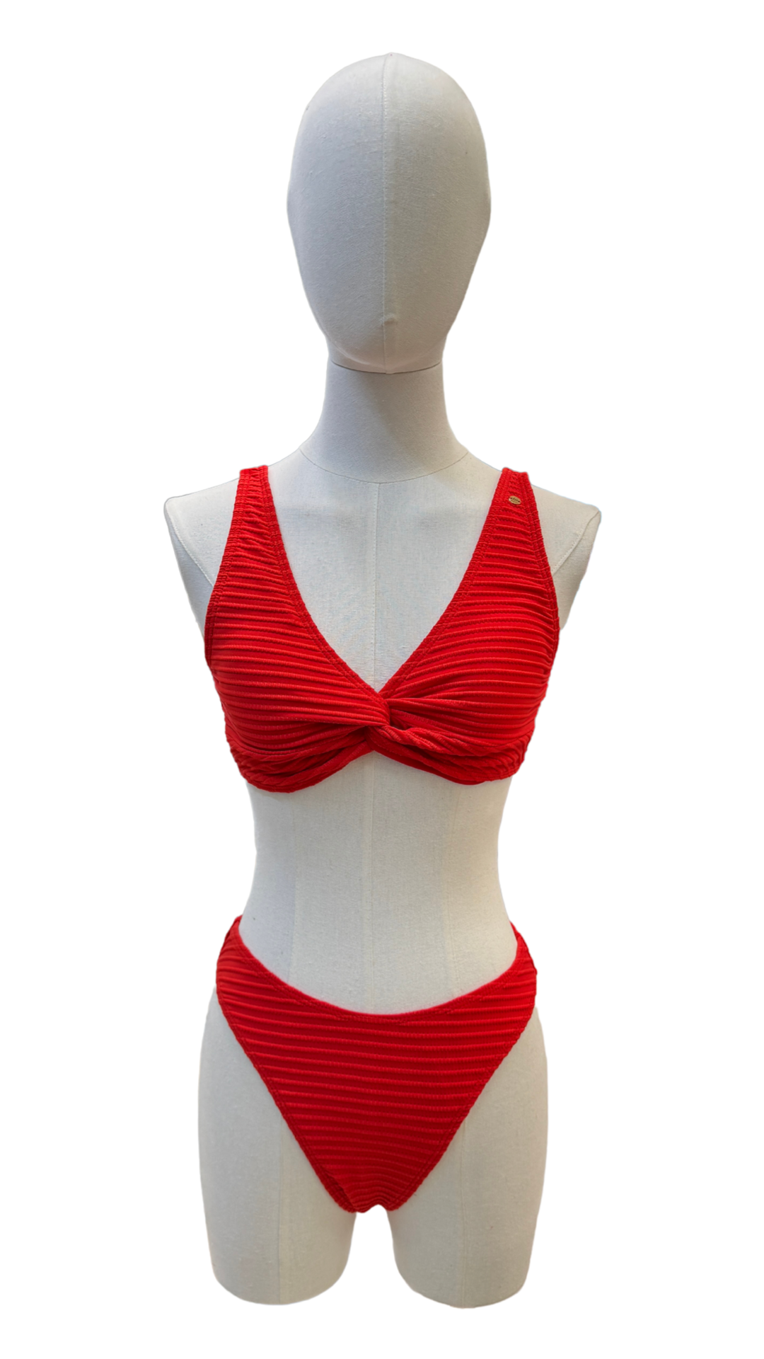 Set bikini de tela con textura, tirantes completamente ajustables, cobertura media en glúteos.
