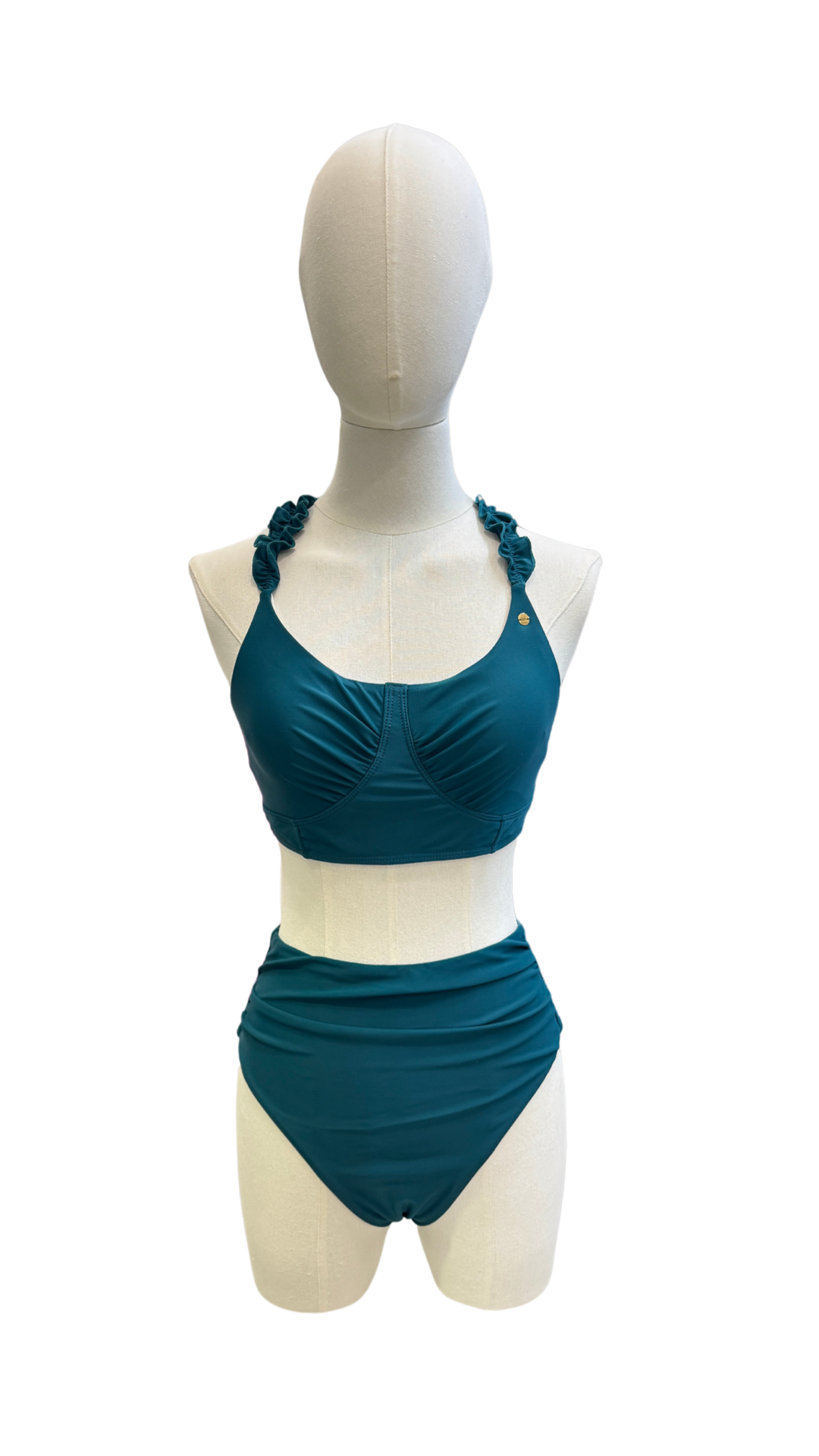 Set bikini de tiro alto, bottom con cobertura amplia en glúteos.