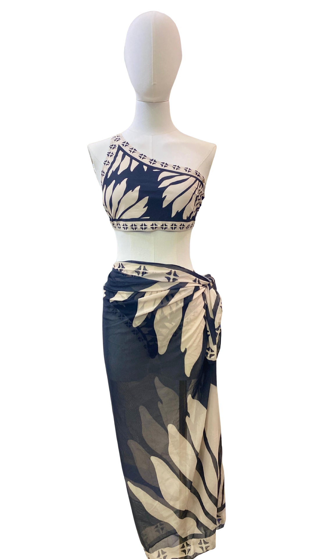 Set bikini de un tirante de tiro alto + pareo largo de tela mesh.