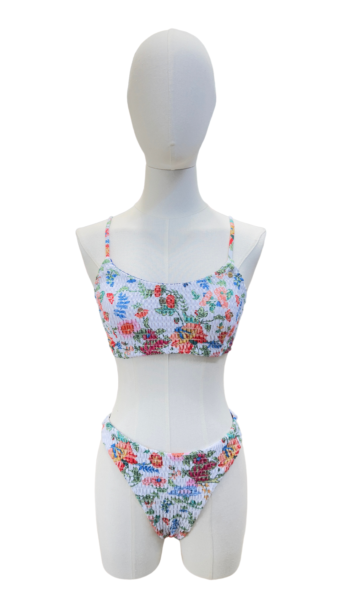 Set bikini floral con tela fruncida, top con tirantes ajustables , bottom a la cadera con cobertura media en glúteos.