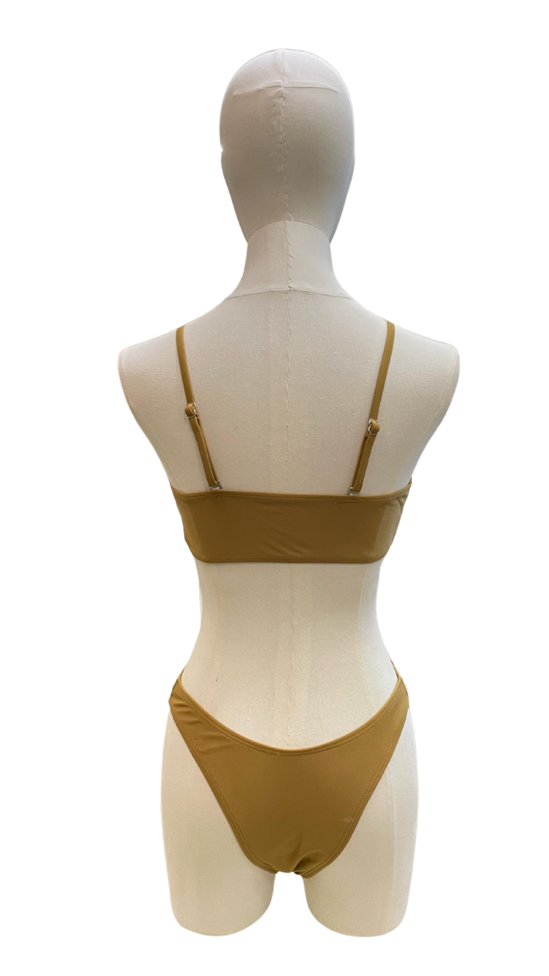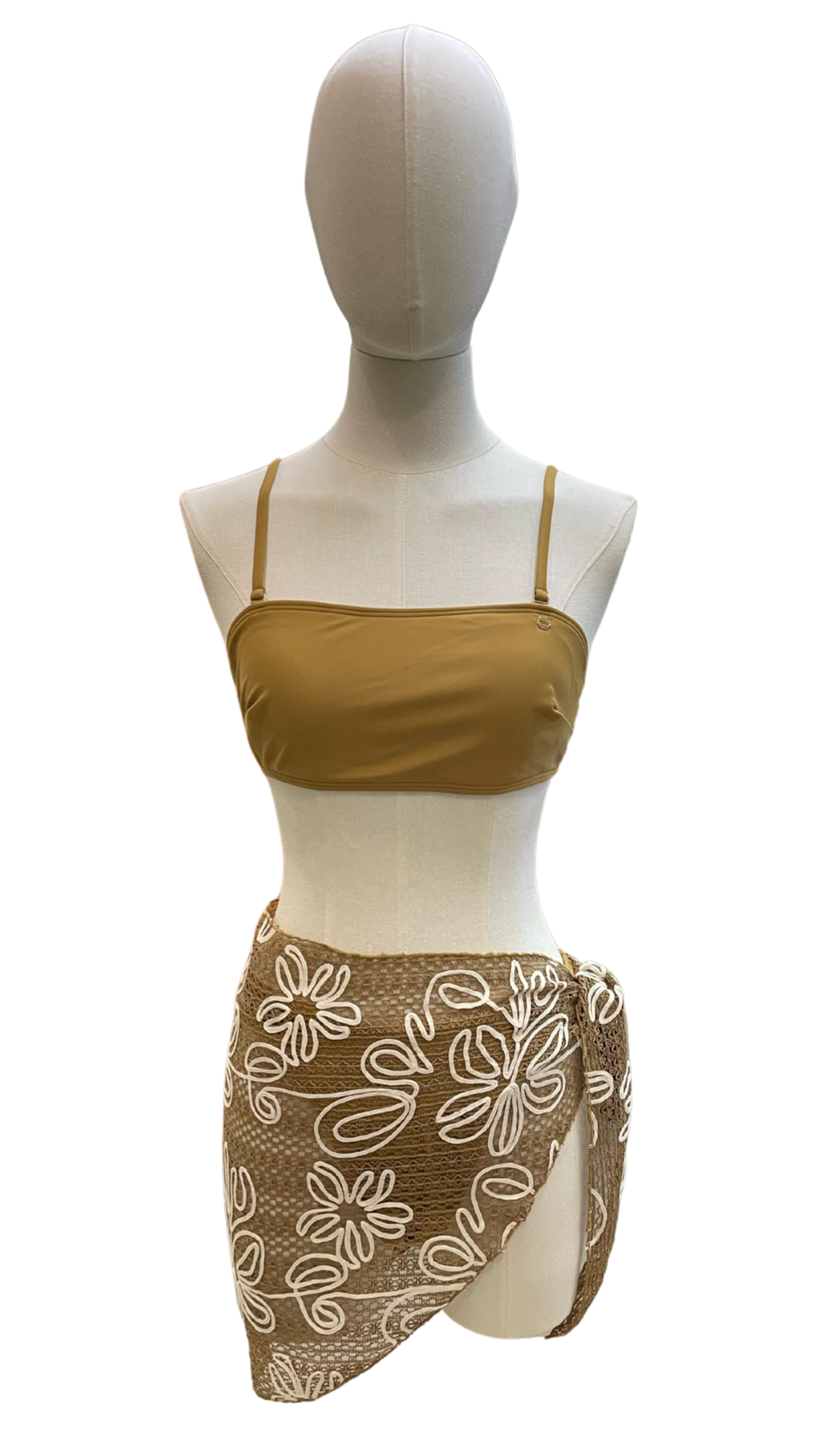 Set bikini + pareo corto bordado, tirantes ajustables y bottom con cobertura media en glúteos.
