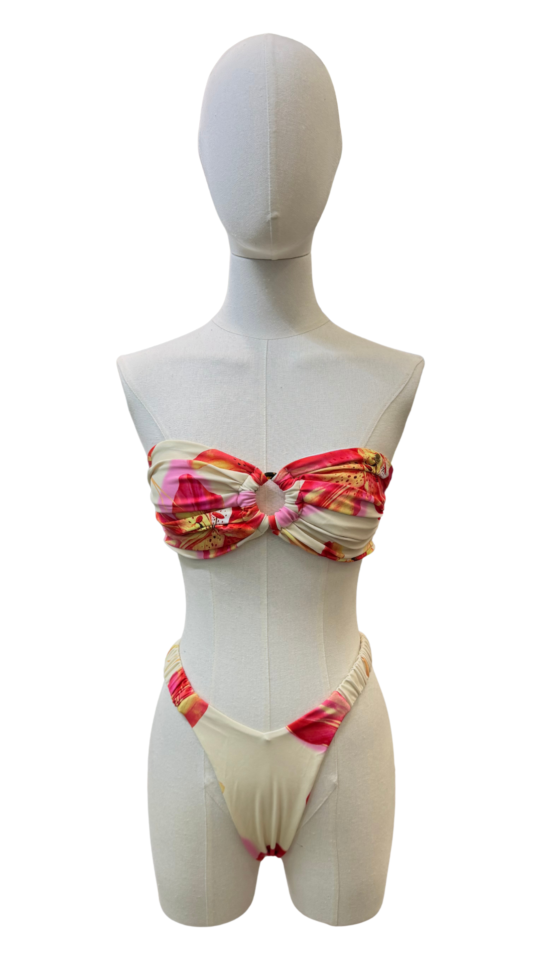Set bikini strapless estampado tropical, bottom tipo V, cobertura baja en glúteos. Top ajustable.