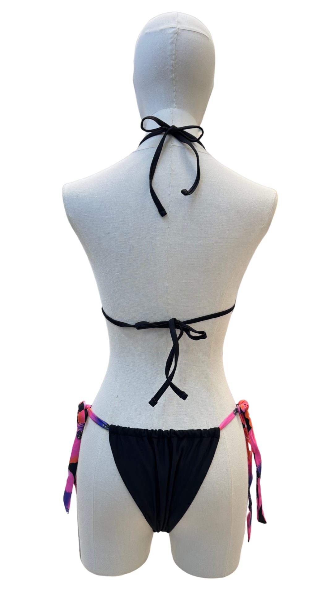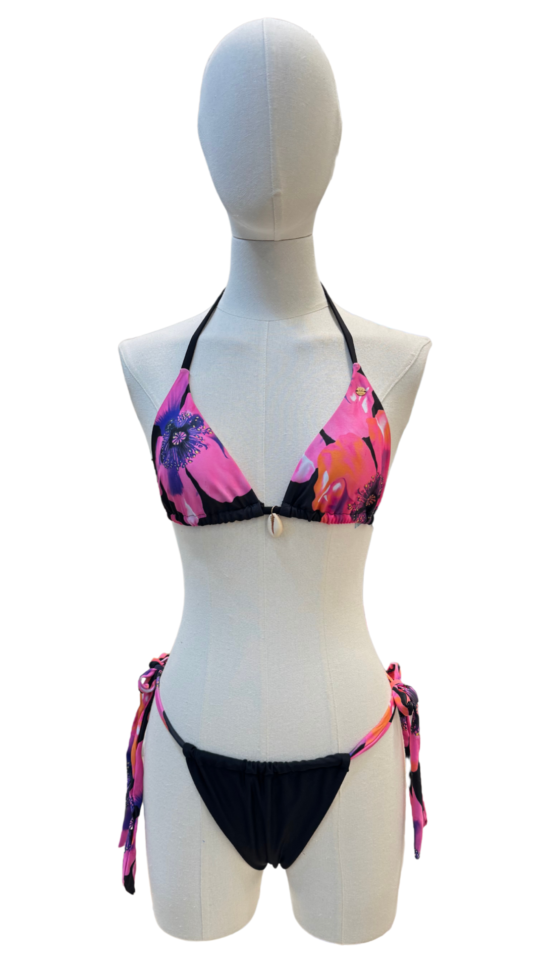Set bikini tropical ajustable, cobertura baja en glúteos. Detalle de concha.