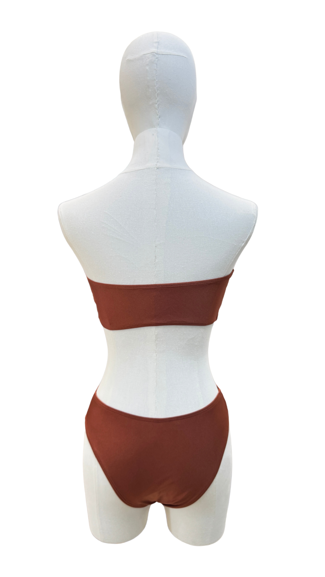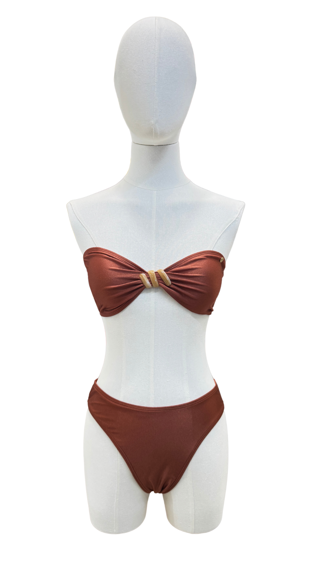 Set bikini strapless con detalle en top, tela con destellos y bottom con cobertura media en glúteos.