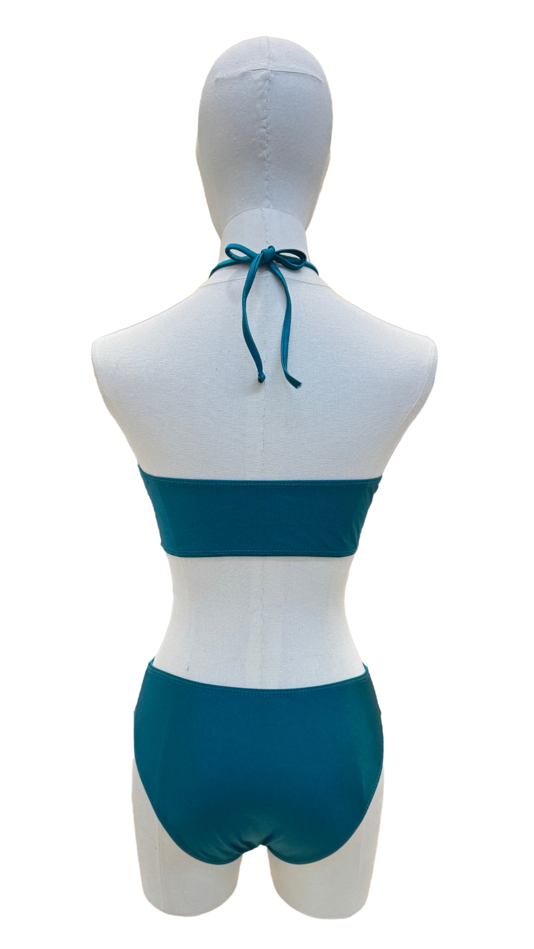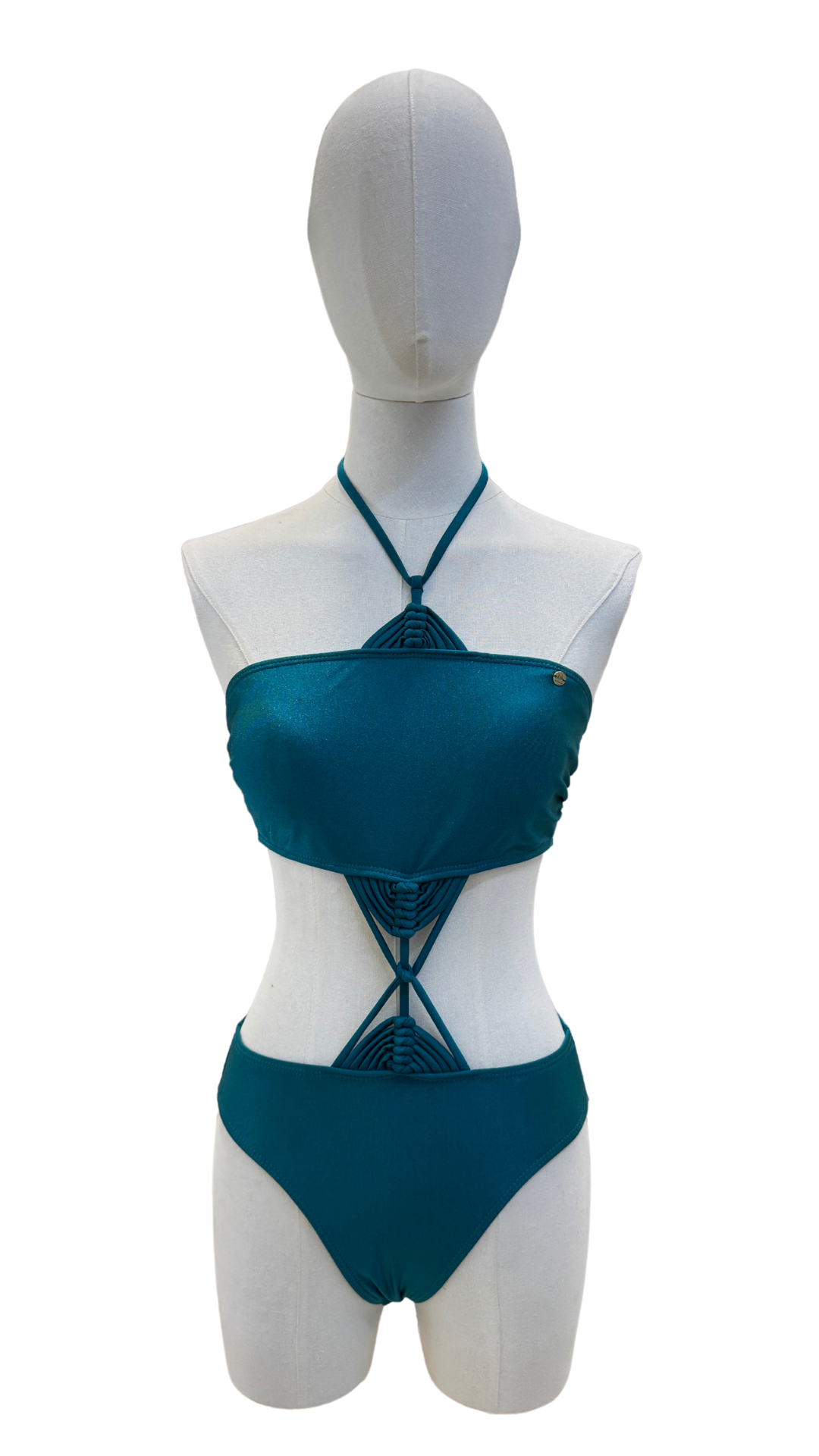 Trikini con detalles tejidos, tirantes ajustables, cobertura amplia en glúteos.